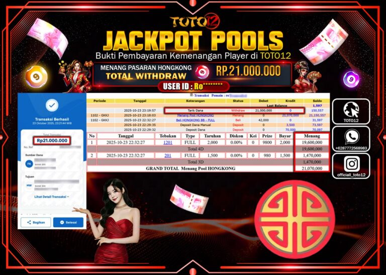 Selamat kepada Member Kami Ah****** Telah Jackpot dan berhasil mendapatkan kemenangan besar pada permainan JACKPOT POOLS PASARAN (MACAU 4D) Dengan Kemenangan Sebesar Rp.20.505.000 –. Setelah mengisi Fomulir Withdraw dengan Kurang waktu 1-2 Menit Dana sudah kami Trasnfer kepada Pemilik Userid dan dana sudah dapat di cairkan oleh pemenang. Bukti Pembayaran yang TOTO12 berikan merupakan Bukti Pembayaran…