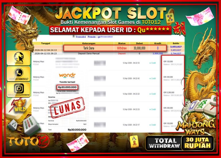 Selamat kepada Member Kami Qu***** Telah Jackpot dan berhasil mendapatkan kemenangan besar pada permainan JACKPOT SLOT GAME (MAHJONG WAYS) Dengan Kemenangan Sebesar Rp.30.000.000–. Setelah mengisi Fomulir Withdraw dengan Kurang waktu 1-2 Menit Dana sudah kami Trasnfer kepada Pemilik Userid dan dana sudah dapat di cairkan oleh pemenang. Bukti Pembayaran yang TOTO12 berikan merupakan Bukti Pembayaran yang SAH…
