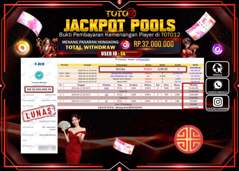 Selamat kepada Member Kami Sk****** Telah Jackpot dan berhasil mendapatkan kemenangan besar pada permainan JACKPOT POOLS PASARAN ( HONGKONG ) Dengan Kemenangan Sebesar Rp.32.000.000–. Setelah mengisi Fomulir Withdraw dengan Kurang waktu 1-2 Menit Dana sudah kami Trasnfer kepada Pemilik Userid dan dana sudah dapat di cairkan oleh pemenang. Bukti Pembayaran yang TOTO12 berikan merupakan Bukti Pembayaran…