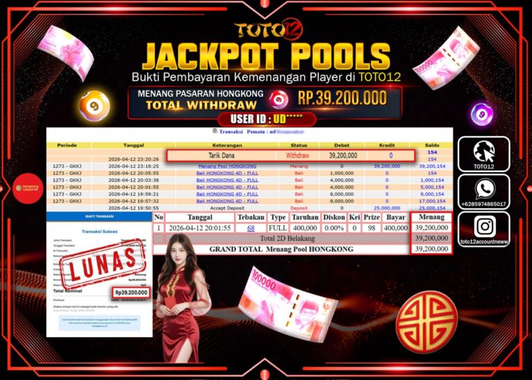 Selamat kepada Member Kami UD****** Telah Jackpot dan berhasil mendapatkan kemenangan besar pada permainan JACKPOT POOLS PASARAN ( HONGKONG ) Dengan Kemenangan Sebesar Rp.39.200.000–. Setelah mengisi Fomulir Withdraw dengan Kurang waktu 1-2 Menit Dana sudah kami Trasnfer kepada Pemilik Userid dan dana sudah dapat di cairkan oleh pemenang. Bukti Pembayaran yang TOTO12 berikan merupakan Bukti Pembayaran…