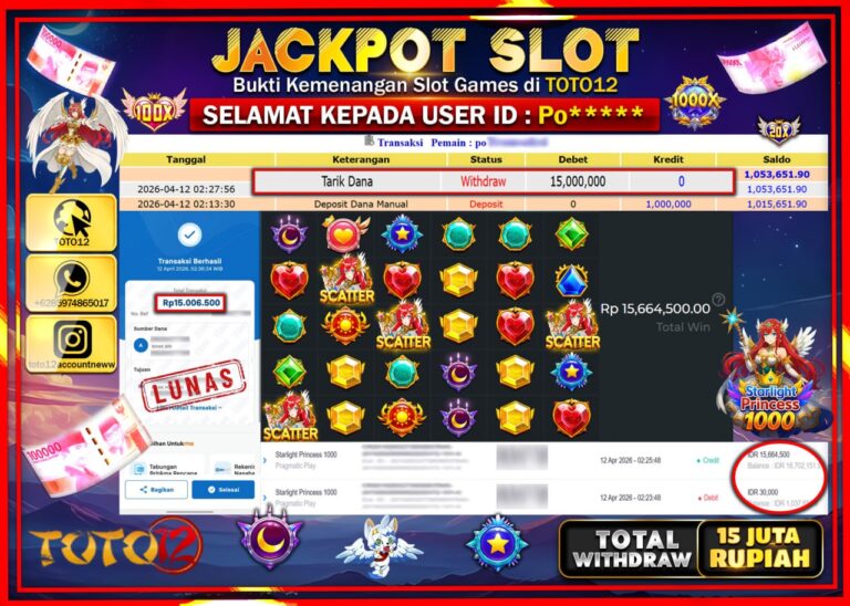 Selamat kepada Member Kami Po***** Telah Jackpot dan berhasil mendapatkan kemenangan besar pada permainan JACKPOT SLOT GAME (STARLIGHT PRINCESS 1000) Dengan Kemenangan Sebesar Rp.15.000.000–. Setelah mengisi Fomulir Withdraw dengan Kurang waktu 1-2 Menit Dana sudah kami Trasnfer kepada Pemilik Userid dan dana sudah dapat di cairkan oleh pemenang. Bukti Pembayaran yang TOTO12 berikan merupakan Bukti Pembayaran…