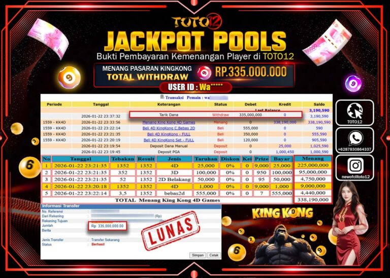Selamat kepada Member Kami Wa****** Telah Jackpot dan berhasil mendapatkan kemenangan besar pada permainan JACKPOT POOLS PASARAN (KING KONG) Dengan Kemenangan Sebesar Rp.335.000.000 –. Setelah mengisi Fomulir Withdraw dengan Kurang waktu 1-2 Menit Dana sudah kami Trasnfer kepada Pemilik Userid dan dana sudah dapat di cairkan oleh pemenang. Bukti Pembayaran yang TOTO12 berikan merupakan Bukti Pembayaran…