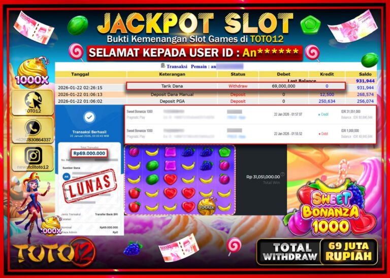 Selamat kepada Member Kami An****** Telah Jackpot dan berhasil mendapatkan kemenangan besar pada permainan JACKPOT SLOT GAME (SWEET BONANZA 1000) Dengan Kemenangan Sebesar Rp.69.000.000 –. Setelah mengisi Fomulir Withdraw dengan Kurang waktu 1-2 Menit Dana sudah kami Trasnfer kepada Pemilik Userid dan dana sudah dapat di cairkan oleh pemenang. Bukti Pembayaran yang TOTO12 berikan merupakan Bukti…