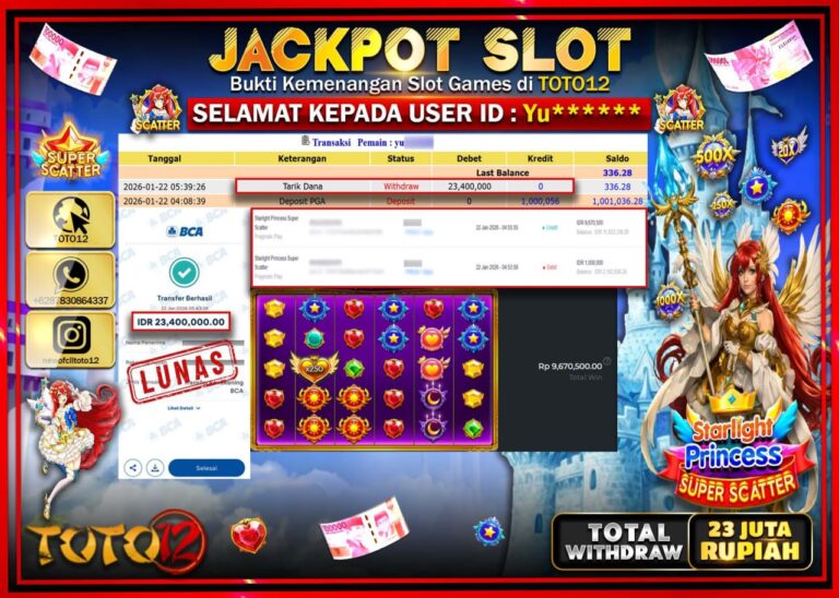 Selamat kepada Member Kami Yu****** Telah Jackpot dan berhasil mendapatkan kemenangan besar pada permainan JACKPOT SLOT GAME (STARLIGHT PRINCESS SUPER SCATTER) Dengan Kemenangan Sebesar Rp.23.400.000 –. Setelah mengisi Fomulir Withdraw dengan Kurang waktu 1-2 Menit Dana sudah kami Trasnfer kepada Pemilik Userid dan dana sudah dapat di cairkan oleh pemenang. Bukti Pembayaran yang TOTO12 berikan merupakan…