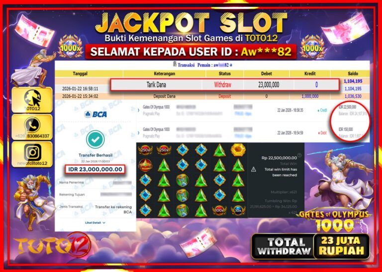 Selamat kepada Member Kami Aw****** Telah Jackpot dan berhasil mendapatkan kemenangan besar pada permainan JACKPOT SLOT GAME (GATES OF OLYMPUS 1000) Dengan Kemenangan Sebesar Rp.23.000.000 –. Setelah mengisi Fomulir Withdraw dengan Kurang waktu 1-2 Menit Dana sudah kami Trasnfer kepada Pemilik Userid dan dana sudah dapat di cairkan oleh pemenang. Bukti Pembayaran yang TOTO12 berikan merupakan…