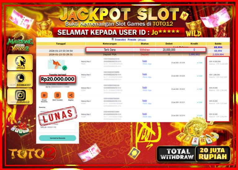 Selamat kepada Member Kami Jo****** Telah Jackpot dan berhasil mendapatkan kemenangan besar pada permainan JACKPOT SLOT GAME (MAHJONG WAYS 2) Dengan Kemenangan Sebesar Rp.20.000.000 –. Setelah mengisi Fomulir Withdraw dengan Kurang waktu 1-2 Menit Dana sudah kami Trasnfer kepada Pemilik Userid dan dana sudah dapat di cairkan oleh pemenang. Bukti Pembayaran yang TOTO12 berikan merupakan Bukti…