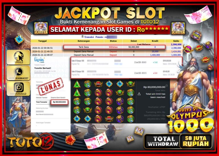 Selamat kepada Member Kami Ro****** Telah Jackpot dan berhasil mendapatkan kemenangan besar pada permainan JACKPOT SLOT GAME (GATES OF OLYMPUS 1000) Dengan Kemenangan Sebesar Rp.58.000.000 –. Setelah mengisi Fomulir Withdraw dengan Kurang waktu 1-2 Menit Dana sudah kami Trasnfer kepada Pemilik Userid dan dana sudah dapat di cairkan oleh pemenang. Bukti Pembayaran yang TOTO12 berikan merupakan…