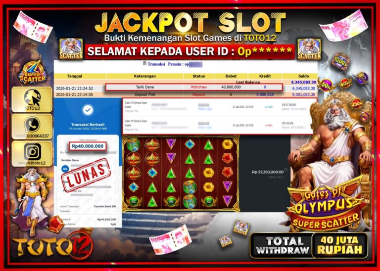 Selamat kepada Member Kami Op****** Telah Jackpot dan berhasil mendapatkan kemenangan besar pada permainan JACKPOT SLOT GAME (GATES OF OLYMPUS SUPER SCATTER) Dengan Kemenangan Sebesar Rp.40.000.000 –. Setelah mengisi Fomulir Withdraw dengan Kurang waktu 1-2 Menit Dana sudah kami Trasnfer kepada Pemilik Userid dan dana sudah dapat di cairkan oleh pemenang. Bukti Pembayaran yang TOTO12 berikan…