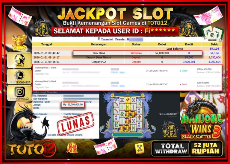 Selamat kepada Member Kami Fi****** Telah Jackpot dan berhasil mendapatkan kemenangan besar pada permainan JACKPOT SLOT GAME (MAHJONG WINS 3 BLACK SCATTER) Dengan Kemenangan Sebesar Rp.52.000.000 –. Setelah mengisi Fomulir Withdraw dengan Kurang waktu 1-2 Menit Dana sudah kami Trasnfer kepada Pemilik Userid dan dana sudah dapat di cairkan oleh pemenang. Bukti Pembayaran yang TOTO12 berikan…