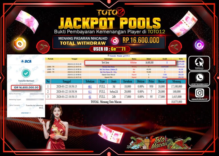 Selamat kepada Member Kami Ge****** Telah Jackpot dan berhasil mendapatkan kemenangan besar pada permainan JACKPOT POOLS PASARAN (MACAU 4D) Dengan Kemenangan Sebesar Rp.16.600.000 –. Setelah mengisi Fomulir Withdraw dengan Kurang waktu 1-2 Menit Dana sudah kami Trasnfer kepada Pemilik Userid dan dana sudah dapat di cairkan oleh pemenang. Bukti Pembayaran yang TOTO12 berikan merupakan Bukti Pembayaran…