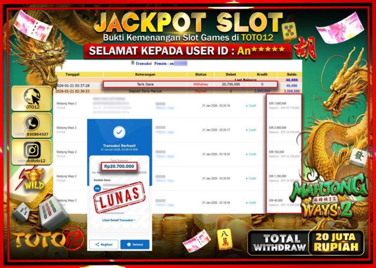 Selamat kepada Member Kami An****** Telah Jackpot dan berhasil mendapatkan kemenangan besar pada permainan JACKPOT SLOT GAME (MAHJONG WAYS 2) Dengan Kemenangan Sebesar Rp.20.700.000 –. Setelah mengisi Fomulir Withdraw dengan Kurang waktu 1-2 Menit Dana sudah kami Trasnfer kepada Pemilik Userid dan dana sudah dapat di cairkan oleh pemenang. Bukti Pembayaran yang TOTO12 berikan merupakan Bukti…