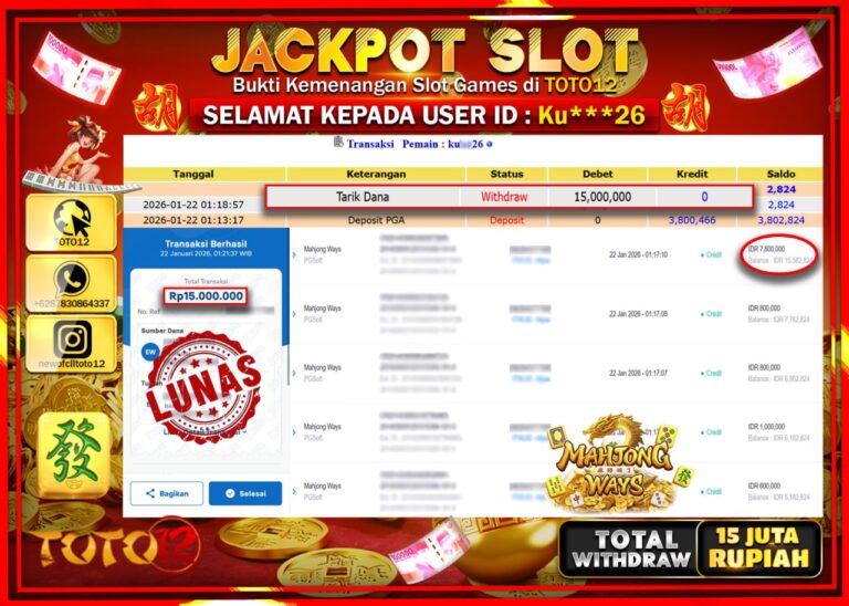 Selamat kepada Member Kami Ku****** Telah Jackpot dan berhasil mendapatkan kemenangan besar pada permainan JACKPOT SLOT GAME (MAHJONG WAYS) Dengan Kemenangan Sebesar Rp.15.000.000 –. Setelah mengisi Fomulir Withdraw dengan Kurang waktu 1-2 Menit Dana sudah kami Trasnfer kepada Pemilik Userid dan dana sudah dapat di cairkan oleh pemenang. Bukti Pembayaran yang TOTO12 berikan merupakan Bukti Pembayaran…