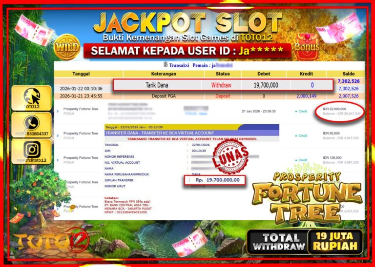 Selamat kepada Member Kami Ja****** Telah Jackpot dan berhasil mendapatkan kemenangan besar pada permainan JACKPOT SLOT GAME (PROSPERITY FORTUNE TREE) Dengan Kemenangan Sebesar Rp.19.700.000 –. Setelah mengisi Fomulir Withdraw dengan Kurang waktu 1-2 Menit Dana sudah kami Trasnfer kepada Pemilik Userid dan dana sudah dapat di cairkan oleh pemenang. Bukti Pembayaran yang TOTO12 berikan merupakan Bukti…