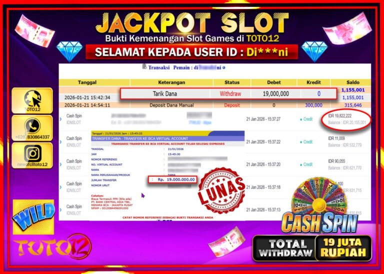 Selamat kepada Member Kami Di****** Telah Jackpot dan berhasil mendapatkan kemenangan besar pada permainan JACKPOT SLOT GAME (CASH SPIN) Dengan Kemenangan Sebesar Rp.19.000.000 –. Setelah mengisi Fomulir Withdraw dengan Kurang waktu 1-2 Menit Dana sudah kami Trasnfer kepada Pemilik Userid dan dana sudah dapat di cairkan oleh pemenang. Bukti Pembayaran yang TOTO12 berikan merupakan Bukti Pembayaran…