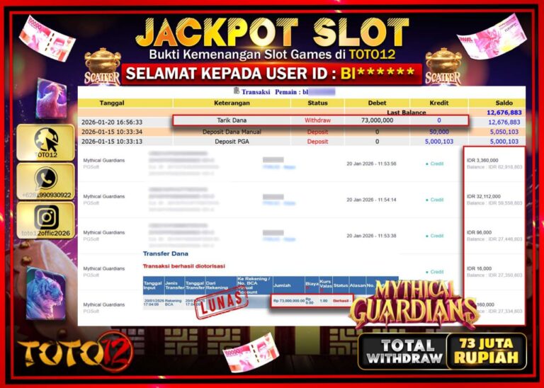 Selamat kepada Member Kami Bl****** Telah Jackpot dan berhasil mendapatkan kemenangan besar pada permainan JACKPOT SLOT GAME (MYTHICAL GUARDIANS) Dengan Kemenangan Sebesar Rp.73.000.000 –. Setelah mengisi Fomulir Withdraw dengan Kurang waktu 1-2 Menit Dana sudah kami Trasnfer kepada Pemilik Userid dan dana sudah dapat di cairkan oleh pemenang. Bukti Pembayaran yang TOTO12 berikan merupakan Bukti Pembayaran…