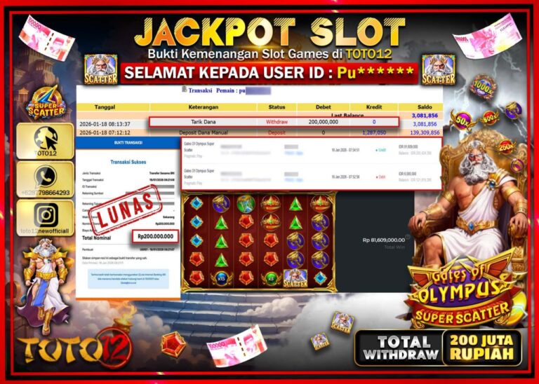Selamat kepada Member Kami Pu****** Telah Jackpot dan berhasil mendapatkan kemenangan besar pada permainan JACKPOT SLOT GAME (GATES OF OLYMPUS SUPER SCATTER) Dengan Kemenangan Sebesar Rp.200.000.000 –. Setelah mengisi Fomulir Withdraw dengan Kurang waktu 1-2 Menit Dana sudah kami Trasnfer kepada Pemilik Userid dan dana sudah dapat di cairkan oleh pemenang. Bukti Pembayaran yang TOTO12 berikan…