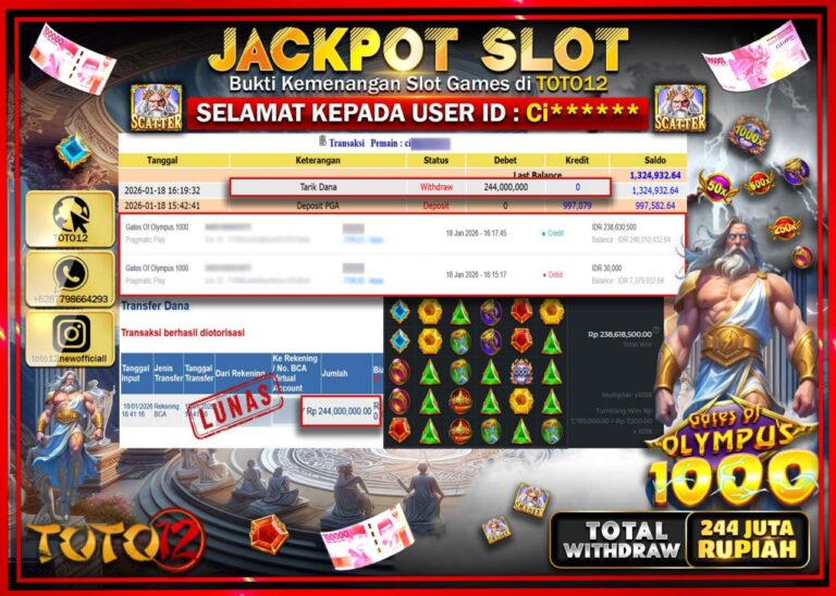 Selamat kepada Member Kami Ci****** Telah Jackpot dan berhasil mendapatkan kemenangan besar pada permainan JACKPOT SLOT GAME (GATES OF OLYMPUS 1000) Dengan Kemenangan Sebesar Rp.244.000.000 –. Setelah mengisi Fomulir Withdraw dengan Kurang waktu 1-2 Menit Dana sudah kami Trasnfer kepada Pemilik Userid dan dana sudah dapat di cairkan oleh pemenang. Bukti Pembayaran yang TOTO12 berikan merupakan…