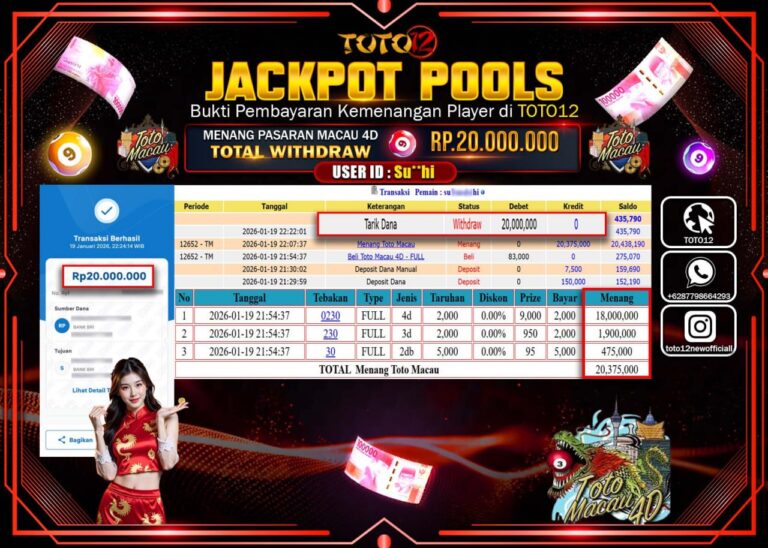 Selamat kepada Member Kami Su****** Telah Jackpot dan berhasil mendapatkan kemenangan besar pada permainan JACKPOT POOLS PASARAN (MACAU 4D) Dengan Kemenangan Sebesar Rp.20.000.000 –. Setelah mengisi Fomulir Withdraw dengan Kurang waktu 1-2 Menit Dana sudah kami Trasnfer kepada Pemilik Userid dan dana sudah dapat di cairkan oleh pemenang. Bukti Pembayaran yang TOTO12 berikan merupakan Bukti Pembayaran…