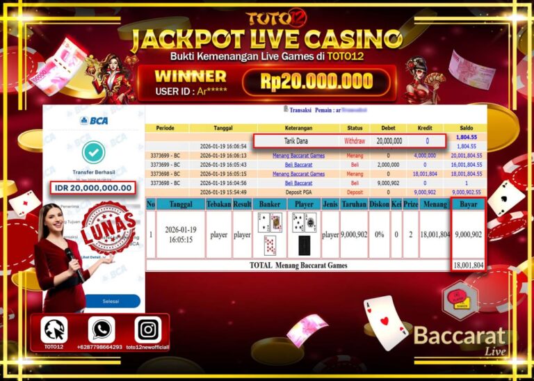 Selamat kepada Member Kami Ar****** Telah Jackpot dan berhasil mendapatkan kemenangan besar pada permainan JACKPOT LIVE CASINO (BACCARAT GAMES) Dengan Kemenangan Sebesar Rp.20.000.000 –. Setelah mengisi Fomulir Withdraw dengan Kurang waktu 1-2 Menit Dana sudah kami Trasnfer kepada Pemilik Userid dan dana sudah dapat di cairkan oleh pemenang. Bukti Pembayaran yang TOTO12 berikan merupakan Bukti Pembayaran…