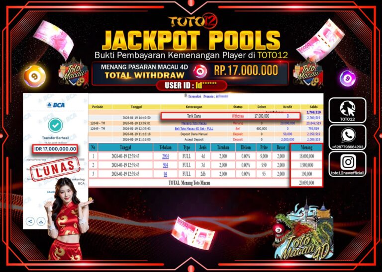 Selamat kepada Member Kami Id****** Telah Jackpot dan berhasil mendapatkan kemenangan besar pada permainan JACKPOT POOLS PASARAN (MACAU 4D) Dengan Kemenangan Sebesar Rp.17.000.000 –. Setelah mengisi Fomulir Withdraw dengan Kurang waktu 1-2 Menit Dana sudah kami Trasnfer kepada Pemilik Userid dan dana sudah dapat di cairkan oleh pemenang. Bukti Pembayaran yang TOTO12 berikan merupakan Bukti Pembayaran…