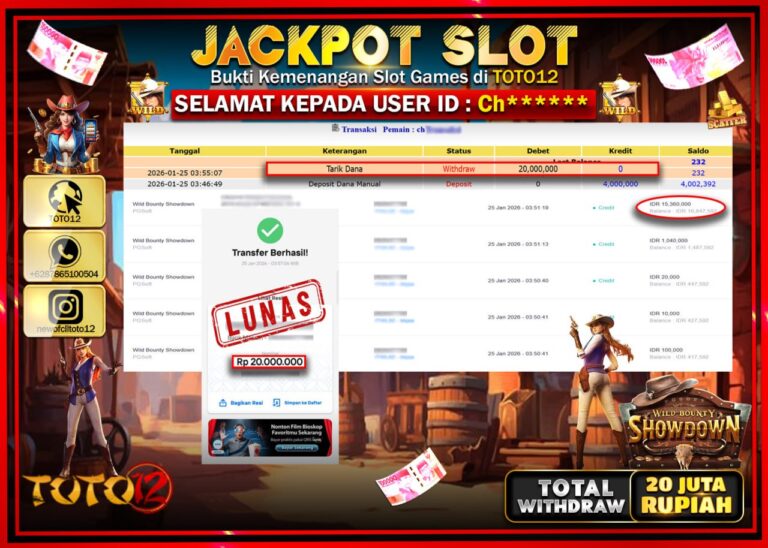 Selamat kepada Member Kami Ch****** Telah Jackpot dan berhasil mendapatkan kemenangan besar pada permainan JACKPOT SLOT GAME (WILD BOUNTY SHOWDOWN) Dengan Kemenangan Sebesar Rp.20.000.000 –. Setelah mengisi Fomulir Withdraw dengan Kurang waktu 1-2 Menit Dana sudah kami Trasnfer kepada Pemilik Userid dan dana sudah dapat di cairkan oleh pemenang. Bukti Pembayaran yang TOTO12 berikan merupakan Bukti…