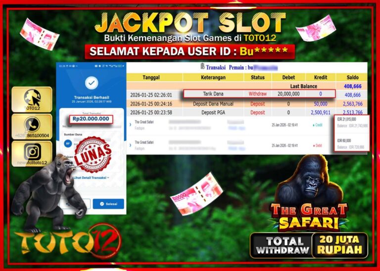 Selamat kepada Member Kami Bu****** Telah Jackpot dan berhasil mendapatkan kemenangan besar pada permainan JACKPOT SLOT GAME (THE GREAT SAFARI) Dengan Kemenangan Sebesar Rp.20.000.000 –. Setelah mengisi Fomulir Withdraw dengan Kurang waktu 1-2 Menit Dana sudah kami Trasnfer kepada Pemilik Userid dan dana sudah dapat di cairkan oleh pemenang. Bukti Pembayaran yang TOTO12 berikan merupakan Bukti…
