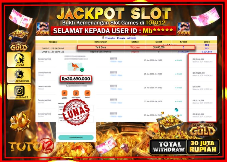Selamat kepada Member Kami Mb****** Telah Jackpot dan berhasil mendapatkan kemenangan besar pada permainan JACKPOT SLOT GAME (GEMSTONES GOLD) Dengan Kemenangan Sebesar Rp.30.690.000 –. Setelah mengisi Fomulir Withdraw dengan Kurang waktu 1-2 Menit Dana sudah kami Trasnfer kepada Pemilik Userid dan dana sudah dapat di cairkan oleh pemenang. Bukti Pembayaran yang TOTO12 berikan merupakan Bukti Pembayaran…