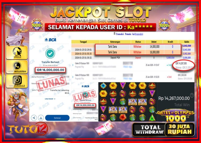 Selamat kepada Member Kami Ka****** Telah Jackpot dan berhasil mendapatkan kemenangan besar pada permainan JACKPOT SLOT GAME (GATES OF OLYMPUS 1000) Dengan Kemenangan Sebesar Rp.30.000.000 –. Setelah mengisi Fomulir Withdraw dengan Kurang waktu 1-2 Menit Dana sudah kami Trasnfer kepada Pemilik Userid dan dana sudah dapat di cairkan oleh pemenang. Bukti Pembayaran yang TOTO12 berikan merupakan…