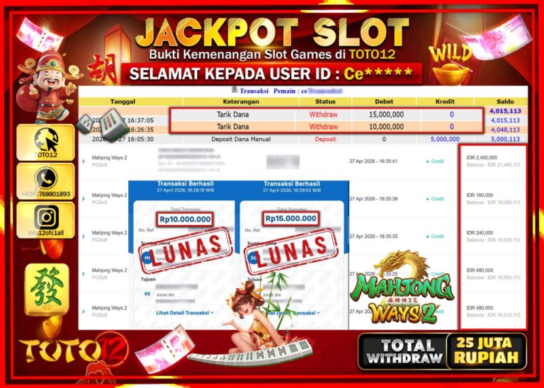 Selamat kepada Member Kami Ce***** Telah Jackpot dan berhasil mendapatkan kemenangan besar pada permainan JACKPOT SLOT GAME (MAHJONG WAYS 2) Dengan Kemenangan Sebesar Rp.25.000.000–. Setelah mengisi Fomulir Withdraw dengan Kurang waktu 1-2 Menit Dana sudah kami Trasnfer kepada Pemilik Userid dan dana sudah dapat di cairkan oleh pemenang. Bukti Pembayaran yang TOTO12 berikan merupakan Bukti Pembayaran…