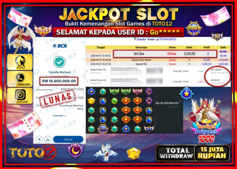 Selamat kepada Member Kami Go***** Telah Jackpot dan berhasil mendapatkan kemenangan besar pada permainan JACKPOT SLOT GAME (STARLIGHT PRINCES 1000) Dengan Kemenangan Sebesar Rp.15.000.000–. Setelah mengisi Fomulir Withdraw dengan Kurang waktu 1-2 Menit Dana sudah kami Trasnfer kepada Pemilik Userid dan dana sudah dapat di cairkan oleh pemenang. Bukti Pembayaran yang TOTO12 berikan merupakan Bukti Pembayaran…