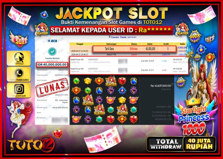 Selamat kepada Member Kami Ra***** Telah Jackpot dan berhasil mendapatkan kemenangan besar pada permainan JACKPOT SLOT GAME (STARLIGHT PRINCES 1000) Dengan Kemenangan Sebesar Rp.40.000.000–. Setelah mengisi Fomulir Withdraw dengan Kurang waktu 1-2 Menit Dana sudah kami Trasnfer kepada Pemilik Userid dan dana sudah dapat di cairkan oleh pemenang. Bukti Pembayaran yang TOTO12 berikan merupakan Bukti Pembayaran…