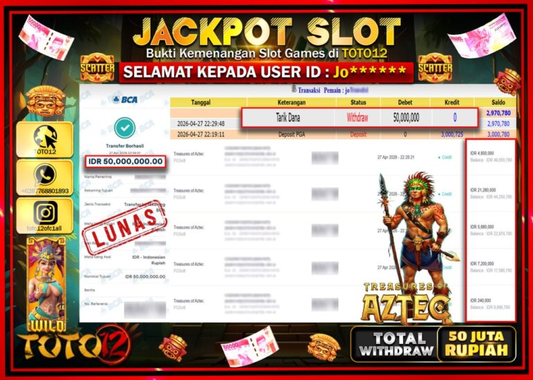 Selamat kepada Member Kami Jo***** Telah Jackpot dan berhasil mendapatkan kemenangan besar pada permainan JACKPOT SLOT GAME (TREASURES OF AZTEC) Dengan Kemenangan Sebesar Rp.50.000.000–. Setelah mengisi Fomulir Withdraw dengan Kurang waktu 1-2 Menit Dana sudah kami Trasnfer kepada Pemilik Userid dan dana sudah dapat di cairkan oleh pemenang. Bukti Pembayaran yang TOTO12 berikan merupakan Bukti Pembayaran…