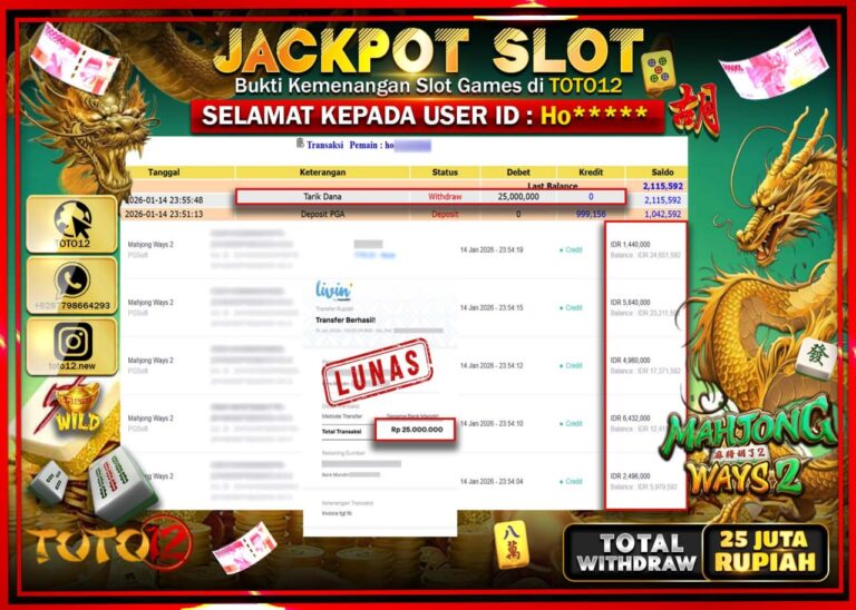 Selamat kepada Member Kami Ho****** Telah Jackpot dan berhasil mendapatkan kemenangan besar pada permainan JACKPOT SLOT GAME (MAHJONG WAYS 2) Dengan Kemenangan Sebesar Rp.25.000.000 –. Setelah mengisi Fomulir Withdraw dengan Kurang waktu 1-2 Menit Dana sudah kami Trasnfer kepada Pemilik Userid dan dana sudah dapat di cairkan oleh pemenang. Bukti Pembayaran yang TOTO12 berikan merupakan Bukti…
