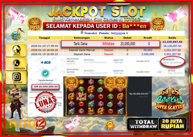 Selamat kepada Member Kami Ba****** Telah Jackpot dan berhasil mendapatkan kemenangan besar pada permainan JACKPOT SLOT GAME (GATES OF GATOT KACA SUPER SCATTER) Dengan Kemenangan Sebesar Rp.20.000.000 –. Setelah mengisi Fomulir Withdraw dengan Kurang waktu 1-2 Menit Dana sudah kami Trasnfer kepada Pemilik Userid dan dana sudah dapat di cairkan oleh pemenang. Bukti Pembayaran yang TOTO12…