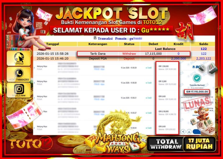 Selamat kepada Member Kami Gu****** Telah Jackpot dan berhasil mendapatkan kemenangan besar pada permainan JACKPOT SLOT GAME (MAHJONG WAYS) Dengan Kemenangan Sebesar Rp.17.115.000 –. Setelah mengisi Fomulir Withdraw dengan Kurang waktu 1-2 Menit Dana sudah kami Trasnfer kepada Pemilik Userid dan dana sudah dapat di cairkan oleh pemenang. Bukti Pembayaran yang TOTO12 berikan merupakan Bukti Pembayaran…