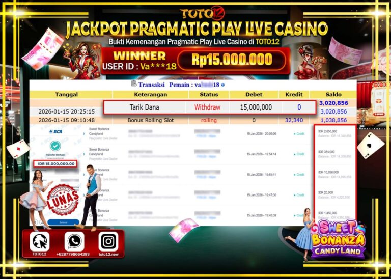 Selamat kepada Member Kami Va****** Telah Jackpot dan berhasil mendapatkan kemenangan besar pada permainan JACKPOT PRAGMATIC PLAY LIVE CASINO (SWEET BONANZA CANDYLAND) Dengan Kemenangan Sebesar Rp.15.000.000 –. Setelah mengisi Fomulir Withdraw dengan Kurang waktu 1-2 Menit Dana sudah kami Trasnfer kepada Pemilik Userid dan dana sudah dapat di cairkan oleh pemenang. Bukti Pembayaran yang TOTO12 berikan…