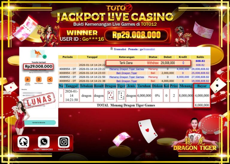 Selamat kepada Member Kami Go****** Telah Jackpot dan berhasil mendapatkan kemenangan besar pada permainan JACKPOT LIVE CASINO (DRAGON TIGER) Dengan Kemenangan Sebesar Rp.29.008.000 –. Setelah mengisi Fomulir Withdraw dengan Kurang waktu 1-2 Menit Dana sudah kami Trasnfer kepada Pemilik Userid dan dana sudah dapat di cairkan oleh pemenang. Bukti Pembayaran yang TOTO12 berikan merupakan Bukti Pembayaran…