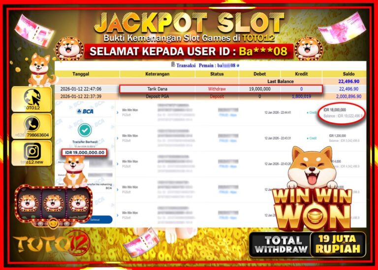 Selamat kepada Member Kami Ba****** Telah Jackpot dan berhasil mendapatkan kemenangan besar pada permainan JACKPOT SLOT GAME (WIN WIN WON) Dengan Kemenangan Sebesar Rp.19.000.000 –. Setelah mengisi Fomulir Withdraw dengan Kurang waktu 1-2 Menit Dana sudah kami Trasnfer kepada Pemilik Userid dan dana sudah dapat di cairkan oleh pemenang. Bukti Pembayaran yang TOTO12 berikan merupakan Bukti…