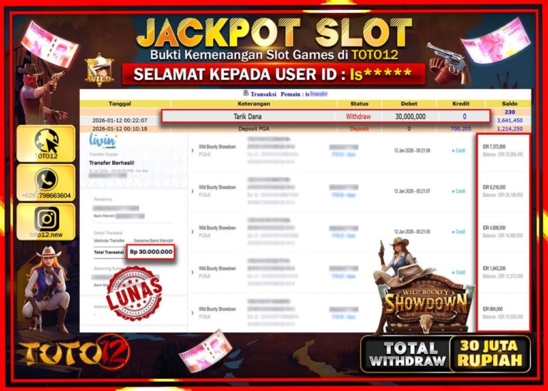 Selamat kepada Member Kami Is****** Telah Jackpot dan berhasil mendapatkan kemenangan besar pada permainan JACKPOT SLOT GAME (WILD BOUNTY SHOWDOWN) Dengan Kemenangan Sebesar Rp.30.000.000 –. Setelah mengisi Fomulir Withdraw dengan Kurang waktu 1-2 Menit Dana sudah kami Trasnfer kepada Pemilik Userid dan dana sudah dapat di cairkan oleh pemenang. Bukti Pembayaran yang TOTO12 berikan merupakan Bukti…
