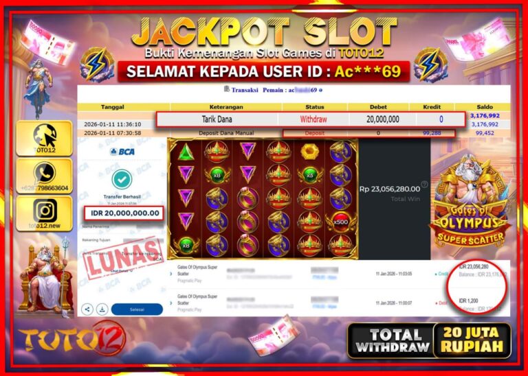 Selamat kepada Member Kami Ac****** Telah Jackpot dan berhasil mendapatkan kemenangan besar pada permainan JACKPOT SLOT GAME (GATES OF OLYMPUS SUPER SCATTER) Dengan Kemenangan Sebesar Rp.20.000.000 –. Setelah mengisi Fomulir Withdraw dengan Kurang waktu 1-2 Menit Dana sudah kami Trasnfer kepada Pemilik Userid dan dana sudah dapat di cairkan oleh pemenang. Bukti Pembayaran yang TOTO12 berikan…
