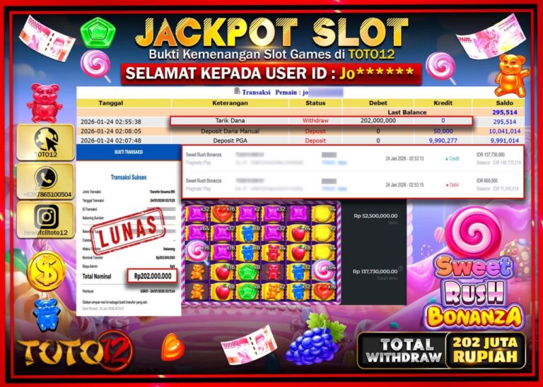 Selamat kepada Member Kami Jo****** Telah Jackpot dan berhasil mendapatkan kemenangan besar pada permainan JACKPOT SLOT GAME (SWEET RUSH BONANZA) Dengan Kemenangan Sebesar Rp.202.000.000 –. Setelah mengisi Fomulir Withdraw dengan Kurang waktu 1-2 Menit Dana sudah kami Trasnfer kepada Pemilik Userid dan dana sudah dapat di cairkan oleh pemenang. Bukti Pembayaran yang TOTO12 berikan merupakan Bukti…