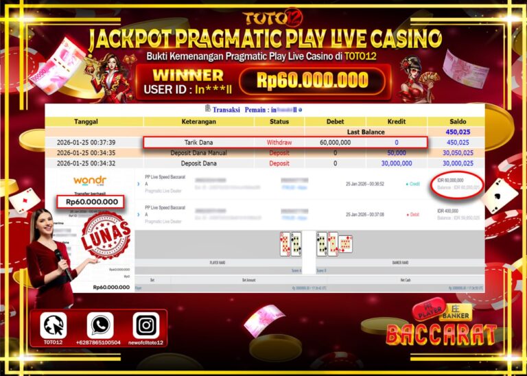 Selamat kepada Member Kami In****** Telah Jackpot dan berhasil mendapatkan kemenangan besar pada permainan JACKPOT PRAGMATIC PLAY LIVE CASINO (SPEED BACCARAT) Dengan Kemenangan Sebesar Rp.60.000.000 –. Setelah mengisi Fomulir Withdraw dengan Kurang waktu 1-2 Menit Dana sudah kami Trasnfer kepada Pemilik Userid dan dana sudah dapat di cairkan oleh pemenang. Bukti Pembayaran yang TOTO12 berikan merupakan…