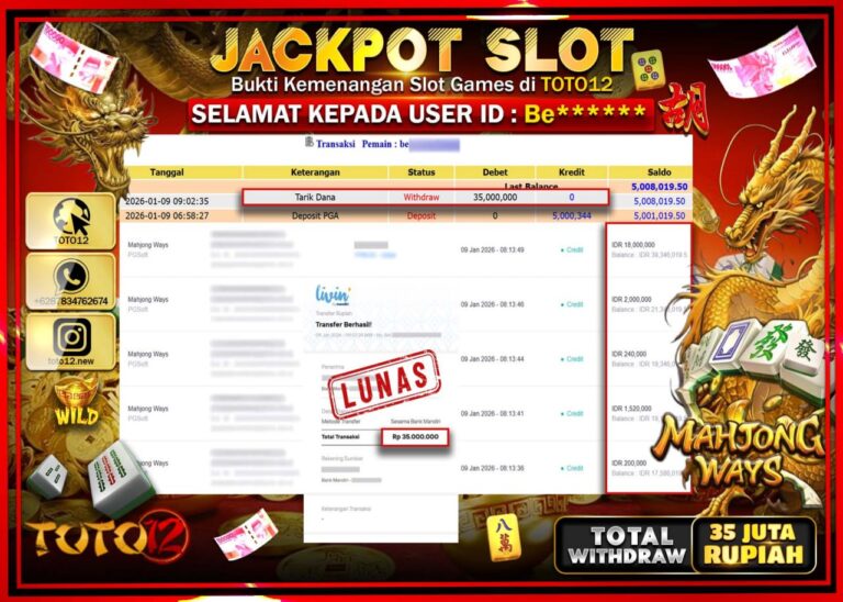 Selamat kepada Member Kami Be****** Telah Jackpot dan berhasil mendapatkan kemenangan besar pada permainan JACKPOT SLOT GAME (MAHJONG WAYS) Dengan Kemenangan Sebesar Rp.35.000.000 –. Setelah mengisi Fomulir Withdraw dengan Kurang waktu 1-2 Menit Dana sudah kami Trasnfer kepada Pemilik Userid dan dana sudah dapat di cairkan oleh pemenang. Bukti Pembayaran yang TOTO12 berikan merupakan Bukti Pembayaran…