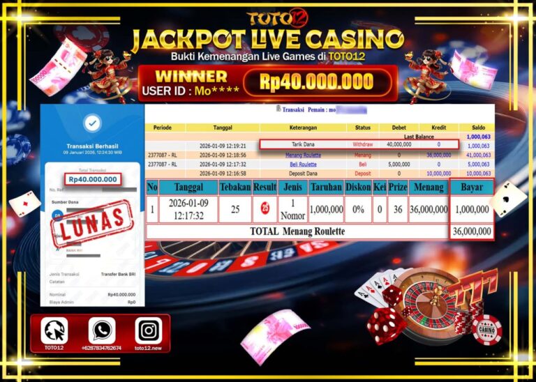 Selamat kepada Member Kami Mo****** Telah Jackpot dan berhasil mendapatkan kemenangan besar pada permainan JACKPOT LIVE CASINO (ROULETTE) Dengan Kemenangan Sebesar Rp.40.000.000 –. Setelah mengisi Fomulir Withdraw dengan Kurang waktu 1-2 Menit Dana sudah kami Trasnfer kepada Pemilik Userid dan dana sudah dapat di cairkan oleh pemenang. Bukti Pembayaran yang TOTO12 berikan merupakan Bukti Pembayaran yang SAH…