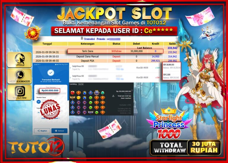 Selamat kepada Member Kami Ce****** Telah Jackpot dan berhasil mendapatkan kemenangan besar pada permainan JACKPOT SLOT GAME (STARLIGHT PRINCESS 1000 Dengan Kemenangan Sebesar Rp.30.000.000 –. Setelah mengisi Fomulir Withdraw dengan Kurang waktu 1-2 Menit Dana sudah kami Trasnfer kepada Pemilik Userid dan dana sudah dapat di cairkan oleh pemenang. Bukti Pembayaran yang TOTO12 berikan merupakan Bukti…