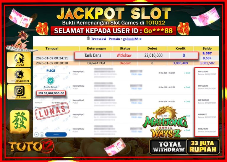 Selamat kepada Member Kami Go****** Telah Jackpot dan berhasil mendapatkan kemenangan besar pada permainan JACKPOT SLOT GAME (MAHJONG WAYS 2) Dengan Kemenangan Sebesar Rp.33.010.000 –. Setelah mengisi Fomulir Withdraw dengan Kurang waktu 1-2 Menit Dana sudah kami Trasnfer kepada Pemilik Userid dan dana sudah dapat di cairkan oleh pemenang. Bukti Pembayaran yang TOTO12 berikan merupakan Bukti…