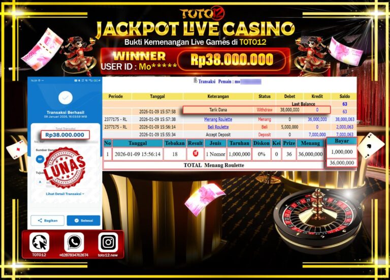 Selamat kepada Member Kami Mo****** Telah Jackpot dan berhasil mendapatkan kemenangan besar pada permainan JACKPOT LIVE CASINO (ROULETTE) Dengan Kemenangan Sebesar Rp.38.000.000 –. Setelah mengisi Fomulir Withdraw dengan Kurang waktu 1-2 Menit Dana sudah kami Trasnfer kepada Pemilik Userid dan dana sudah dapat di cairkan oleh pemenang. Bukti Pembayaran yang TOTO12 berikan merupakan Bukti Pembayaran yang SAH…