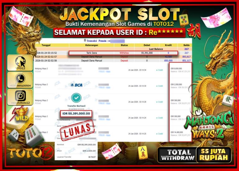 Selamat kepada Member Kami Re****** Telah Jackpot dan berhasil mendapatkan kemenangan besar pada permainan JACKPOT SLOT GAME (MAHJONG WAYS 2) Dengan Kemenangan Sebesar Rp.55.391.000 –. Setelah mengisi Fomulir Withdraw dengan Kurang waktu 1-2 Menit Dana sudah kami Trasnfer kepada Pemilik Userid dan dana sudah dapat di cairkan oleh pemenang. Bukti Pembayaran yang TOTO12 berikan merupakan Bukti…