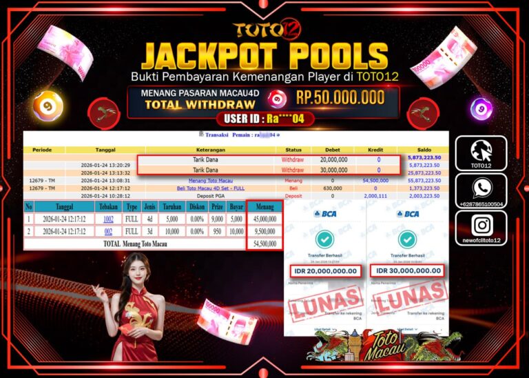 Selamat kepada Member Kami Ra****** Telah Jackpot dan berhasil mendapatkan kemenangan besar pada permainan JACKPOT POOLS PASARAN (MACAU 4D) Dengan Kemenangan Sebesar Rp.50.000.000 –. Setelah mengisi Fomulir Withdraw dengan Kurang waktu 1-2 Menit Dana sudah kami Trasnfer kepada Pemilik Userid dan dana sudah dapat di cairkan oleh pemenang. Bukti Pembayaran yang TOTO12 berikan merupakan Bukti Pembayaran…