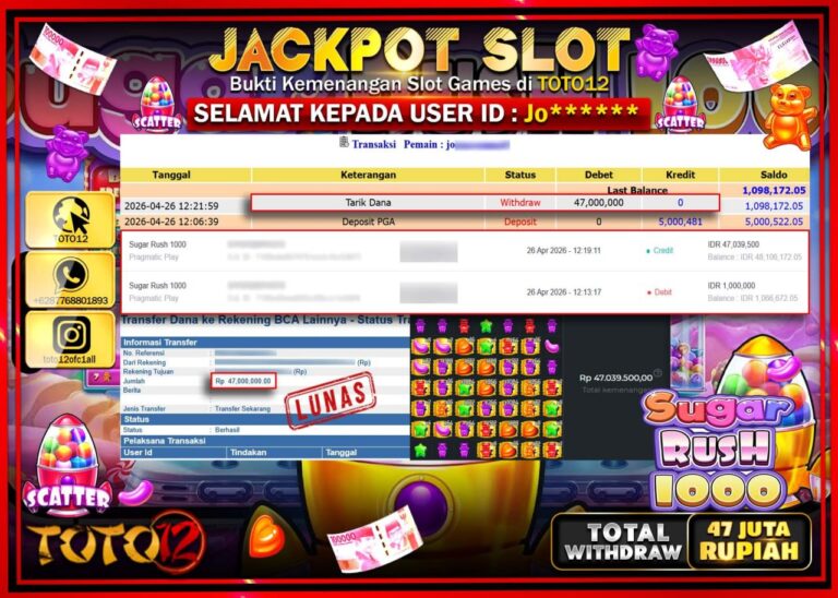 Selamat kepada Member Kami Jo***** Telah Jackpot dan berhasil mendapatkan kemenangan besar pada permainan JACKPOT SLOT GAME (SUGAR RUSH 1000) Dengan Kemenangan Sebesar Rp.47.000.000–. Setelah mengisi Fomulir Withdraw dengan Kurang waktu 1-2 Menit Dana sudah kami Trasnfer kepada Pemilik Userid dan dana sudah dapat di cairkan oleh pemenang. Bukti Pembayaran yang TOTO12 berikan merupakan Bukti Pembayaran…